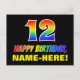 The front of this cheerful, fun, and colorful birthday themed postcard design features a large number "12" and the message "HAPPY BIRTHDAY,", both having a rainbow spectrum gradient inspired pattern coloring, along with a bold yellow customizable recipient name. The front also has a minimalist black colored background. The back of the postcard has a personalized birthday greeting message, or could perhaps be cleared and left blank if a message is to be written by hand instead. A colorful personalized birthday postcard like this might be a fun way of acknowledging somebody’s twelfth birthday. [~Z0000474]