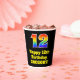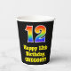 This fun and exciting birthday themed paper cup design features a large number “12” having a rainbow spectrum gradient inspired pattern. It also features the message “Happy 12th Birthday,”, and a personalised name. It also has a black-coloured background. Vibrant, colourful paper cups like this might be fun to use at a birthday party being held to celebrate somebody’s twelfth birthday. [~Z0000537]