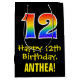 This fun, colourful, and exciting birthday gift bag design features a large number "12" with a rainbow spectrum gradient style pattern, along with the message "Happy 12th Birthday,", and a customisable recipient name. It also has a black-coloured background. A gift bag like this might be a fun way of wrapping a birthday present or gift being given to somebody who is celebrating their 12th birthday. [~Z0000512]