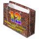 This fun and colourful birthday-themed giftbag design, inspired by urban art and graffiti, features a large number "12" with a rainbow spectrum gradient inspired pattern, along with the message "Happy 12th Birthday,", and a custom name. The background features a brick wall inspired pattern. A giftbag like this might be used when giving a gift or present in honour of somebody’s twelfth birthday. [~Z0000522]
