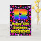 The front of this fun and joyful birthday themed greeting card design features a large number “12” with a rainbow spectrum gradient inspired pattern, along with the message “Happy 12th Birthday,”, and an editable name. The background of the front features a pattern of purple, pink, and red heart shapes of various sizes. The inside has a customisable birthday greeting message, or could perhaps be cleared and left blank if a message is to be written by hand instead. A joyful, editable birthday greeting card like this might be a fun way to deliver a birthday greeting message to somebody who is celebrating their twelfth birthday. [~Z0000551]