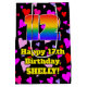 This cheerful and fun birthday-themed gift bag design features a large number “12” with a rainbow spectrum gradient inspired pattern, along with the message “Happy 12th Birthday,”, and a customisable name. The background features a pattern of purple, pink, and red heart shapes. An upbeat gift bag like this might be used when giving a gift or present in honour of somebody’s twelfth birthday. [~Z0000551]
