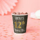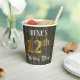 This elegant and opulent birthday themed paper cup design features a personalized name and the message “12th Birthday Party”. The large number “12th” features an imitation/faux gold-inspired coloring pattern, the words “Birthday Party” are in fancy script-style text, and the background has an imitation/faux woodgrain-inspired pattern. Ornate, luxurious paper cups like this might be used at a birthday party being held to honor somebody’s twelfth birthday. [~Z0000568]
