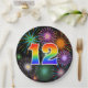 This colourful, fun, and cheerful paper plate design features a large number "12" having a rainbow spectrum gradient inspired pattern colouring. It also features a exciting and vibrant bursting celebratory fireworks inspired pattern. The background is coloured black. Fun paper plates like this might be used at a celebration being held to honour somebody’s twelfth birthday, a twelfth anniversary, or some other twelfth event. [~Z0000490]