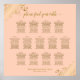 This beautiful 13 table wedding seating chart includes table assignments for 130 guests with 10 seats per table. The design features gold text on a light orange or coral peach coloured background with a lacy script calligraphy title. The corners are decorated with a frilly faux foil filigree with curls and swirls making it both simple and elegant. Stylish, chic and sophisticated way to help your guests find their seats at your reception.