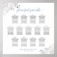 This beautiful 13 table wedding seating chart includes table assignments for 130 guests with 10 seats per table. The design features dark gray and light blue text on a white background with a lacy script calligraphy title. The corners are decorated with a frilly faux foil silver filigree with curls and swirls making it both simple and elegant. Stylish, chic and sophisticated way to help your guests find their seats at your reception.