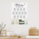 This elegant wedding seating chart has 13 tables and showcases a romantic and sophisticated design featuring a single long-stemmed ivory, white, or cream coloured rose lying on its side and reflecting in a pool of water. With seating arrangements for 130 guests and 10 seats per table, this chart provides ample space for your guests to locate their seats with ease. The title, "Welcome! please find your table," is written in elegant script calligraphy, while there is space available for the names of the couple and the wedding date at the bottom. This chart is an excellent way to add beauty, class, and style to your wedding reception, while also assisting guests in finding their seats.