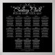 This seating chart shows wedding reception seating assignments for 130 guests at 13 tables. The design is simple, elegant and sophisticated with script lettering, pale silver gray text, a vintage floral filigree in a silver faux foil color, and a black background.
