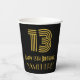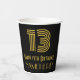 This 1920s-1930s style inspired and vintage look birthday-themed paper cup design features a large art deco inspired style number “13”, along with the birthday greeting message “Happy 13th Birthday,” and a customisable name. The background is coloured black. Vintage look birthday themed paper cups like this might be used at a party for somebody who is celebrating their 13th birthday. [~Z0000546]