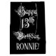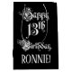 This luxurious and formal birthday gift bag design features the message “Happy 13th Birthday,” in opulent script style text, on a black coloured background. It also has a personalised recipient name. A giftbag like this might be used when wrapping gifts being given to somebody in celebration of their 13th birthday. [~Z0000557]