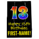 This fun, exciting, and colourful birthday themed giftbag design features a large number "13" with a rainbow spectrum gradient inspired pattern, along with the message "Happy 13th Birthday,", and a personalised recipient name. It also has a black-coloured background. A gift-bag like this might be a fun way of wrapping a birthday present or gift being given to somebody who is celebrating their thirteenth birthday. [~Z0000512]
