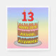 This fun and cheerful birthday themed paper napkin design features a cartoon-style depiction of a three-tier birthday cake having numeral-shaped candles on top showing the number “13“, along with the message “HAPPY 13TH BIRTHDAY,”, and a custom recipient name. The background features a multi-colour pastel rainbow spectrum inspired gradient pattern. Joyful birthday themed paper napkins like these might be used at a party for somebody who is celebrating their 13th birthday. [~Z0000623]