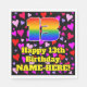 This joyful and colourful birthday themed paper napkin design features a large number “13” with a rainbow spectrum gradient inspired pattern, along with the message “Happy 13th Birthday,”, and a customisable name. The background features a pattern of purple, pink, and red heart shapes of various sizes. Joyful, happy paper napkins like this might be fun to have at a birthday celebration/party being held in celebration of somebody’s 13th birthday. [~Z0000550]