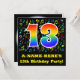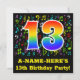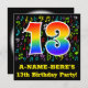 The front of this fun, exciting, and colourful birthday party invitation design features a large number "13" having a rainbow spectrum gradient inspired pattern. It also features an editable name and the message "13th Birthday Party!". Part of the background has a fun pattern of various music notes and symbols having a variety of colours and sizes. The back features customised information/details about the event that the potential guests are being invited to. Vibrant, editable birthday party invitation cards like this might be sent to potential guests of a party being held to honour a song composer’s, a musician’s, a singer’s, or somebody else’s 13th birthday. [~Z0000427]