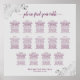 This beautiful wedding seating chart includes table assignments for 140 guests at 14 tables. The simple yet elegant design features magenta or cassis purple text on a gray background with a lacy script calligraphy title. The corners are decorated with a silver frilly faux foil filigree with curls and swirls. Stylish, chic and sophisticated way to help your guests find their seats at your reception.