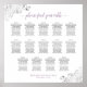 This beautiful wedding seating chart includes table assignments for 140 guests at 14 tables. The simple yet elegant design features dark gray and light purple or lavender text on a white background with a lacy script calligraphy title. The corners are decorated with a frilly silver faux foil filigree with curls and swirls. Stylish, chic and sophisticated way to help your guests find their seats at your reception.