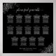This beautiful wedding seating chart includes table assignments for 140 guests at 14 tables. The simple yet elegant design features light gray text on a black background with a lacy script calligraphy title. The corners are decorated with a silver frilly faux foil filigree with curls and swirls. Stylish, chic and sophisticated way to help your guests find their seats at your reception.