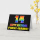 The front of this colorful, fun, and cheerful birthday themed greeting card design features a large number "14" and the message "HAPPY BIRTHDAY,", both having a rainbow spectrum gradient inspired pattern coloring, along with a bold yellow custom recipient name. The front also features a simple black colored background. The inside features a customizable birthday greeting message, or could perhaps be cleared and left blank if a message is to be written by hand instead. A colorful customizable birthday card like this might be a fun way to acknowledge somebody’s fourteenth birthday. [~Z0000472]