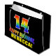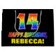 This cheerful, colourful, and fun birthday-themed gift bag design features a large number "14" and the message "HAPPY BIRTHDAY,", both having a rainbow spectrum gradient inspired pattern colouring, along with a bold yellow custom recipient name. The background is coloured black. A fun gift bag like this might be used when wrapping gifts being given to somebody in celebration of their 14th birthday. [~Z0000477]
