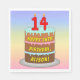This joyful and upbeat birthday themed paper napkin design features a cartoon-style depiction of a three-tier birthday cake having numeral-shaped candles on top showing the number “14“, along with the message “HAPPY 14TH BIRTHDAY,”, and a customisable recipient name. The background features a multicolored pastel rainbow spectrum inspired gradient pattern. Fun birthday themed paper napkins like these might be used at a birthday party in celebration of somebody’s 14th birthday. [~Z0000623]