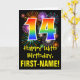 The front of this exciting, colourful, and fun birthday greeting card design features a large number "14" having a rainbow spectrum gradient inspired pattern. It also features the message "Happy 14th Birthday,", and a customisable recipient name. The front additionally features a colourful background pattern inspired by the appearance of bursting celebratory fireworks. The inside features an editable birthday greeting message, or could perhaps be cleared and left blank if a message is to be written by hand instead. A personalised birthday card like this might be a fun way to send a message in celebration of somebody’s fourteenth birthday. [~Z0000442]