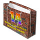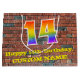 This fun and colourful birthday themed giftbag design, inspired by graffiti, features a large number "14" having a rainbow spectrum gradient inspired pattern. It also features the message "Happy 14th Birthday,", and a personalised name. It also has a brick wall style pattern background. A vibrant birthday themed giftbag like this might be a fun way to wrap a gift or present being given to celebrate somebody’s 14th birthday. [~Z0000522]