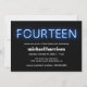 Cool trendy 14th birthday party invitation with "FOURTEEN" in blue glowing neon lights against a black background.