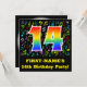 The front of this fun, exciting, and vibrant birthday party invitation design features a large number "14" having a rainbow spectrum gradient inspired pattern. It also features a customisable name and the message "14th Birthday Party!". Part of the background has a fun pattern of various music notes and symbols having a variety of colours and sizes. The back features editable details/information regarding the event that the potential guests are being invited to. Happy, editable birthday party invitation cards like this might be used when inviting guests to attend a gathering being held to celebrate a singer’s, a musician’s, a song composer’s, or somebody else’s 14th birthday. [~Z0000427]