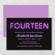 Cool modern 14th birthday party invitation with "FOURTEEN" in purple glowing neon lights against a black background.
