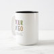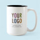 Personalise our 15 oz ceramic mug with your business logo and custom text. The larger 15 ounce size is convenient for employees because they don't need to refill it as often as the standard size mug. Custom logo mugs make a long lasting impression as swag and office gifts. Available in 15 oz (15 ounce) in classic white, two-tone (with inside colour), combo (with inside colour and handle colour), and as a morphing mug. No minimum order quantity and no setup fee.