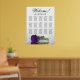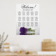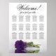 This exquisite wedding seating chart consists of 15 tables and showcases a romantic design featuring a single long-stemmed deep royal purple rose lying on its side and reflecting in a pool of water. The title, "Welcome! please find your table," is written in elegant script, while the names of the couple and the wedding date are displayed at the bottom. With space for 150 guests and 10 seats per table, this chart provides ample seating arrangements for your wedding reception. It is a fantastic way to add elegance, class, and style to your special day, while also helping your guests find their seats with ease.