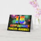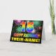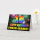 The front of this colorful, cheerful, and fun birthday-themed greeting card design features a large number "15" and the message "HAPPY BIRTHDAY,", both having a rainbow spectrum gradient inspired pattern coloring, along with a bold yellow editable recipient name. The front also features a multicolored background pattern inspired by bursting celebratory fireworks. The inside features a customized birthday greeting message, or could perhaps be cleared and left blank if a message is to be written by hand instead. A vibrant customizable birthday card like this might be a fun way to acknowledge somebody’s fifteenth birthday. [~Z0000471]