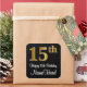 This sophisticated, luxurious, and stylish birthday-themed sticker design features a large ordinal number “15th” having an imitation/faux gold-inspired look, plus the birthday greeting message “Happy 15th Birthday,” and a personalised name in a script-style font. It also has a black-coloured background. Luxurious birthday themed stickers like this may be used when wrapping a gift or present being given to celebrate somebody’s 15th birthday, or perhaps might be given out to the guests at a birthday party. [~Z0000517]
