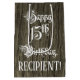 This elaborate and ornate birthday-themed giftbag design features the message “Happy 15th Birthday,” in lavish script style text, on a faux wood look pattern background. It also features a customisable recipient name. A gift bag like this might be used when wrapping gifts being given to somebody in celebration of their 15th birthday. [~Z0000558]