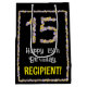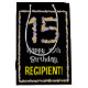 This fun, botany-inspired birthday-themed gift bag design has the message “Happy 15th Birthday,” and an editable recipient name. The large number “15” and the border both consist of flower icons. A birthday themed gift bag like this might be a fun way to wrap a present being given to somebody who is celebrating their fifteenth birthday. [~Z0000653]