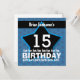 15th Birthday Party ANY YEAR Black Blue STAR BLUE Background. This contemporary design with its big and bold lettering and layered stars is a fun way to invite folks to a kid, tween or teen birthday celebration. Text on card is totally customisable - You can also change the text colours for a different look. You can experiment with different paper types by clicking on the "Invitation Options" tab on the upper right hand corner. I recommend the ice hued metallic paper, which gives your birthday invitation a festive shimmer and shine. Suitable for a 1st 2nd 3rd 4th 5th 6th 7th 8th 9th 10th 11th 12th 13th 14th 15th 16th 17th 18th 19th birthday or any year you need.