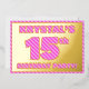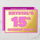 The front of this fun and bold fifteenth birthday celebration foil invitation/announcement card features a personalised name, a large number “15th”, the message “BIRTHDAY PARTY!”, and a border, all featuring a girly light pink and dark pink striped pattern. The back features personalised details about the event, such as the date, time, place/venue, and any other useful information. Personalised invitations like these might be used to invite guests/attendees to a birthday party being held to celebrate somebody’s 15th birthday. [~Z0000597]