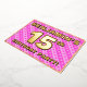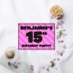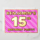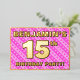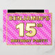 The front of this upbeat and joyful fifteenth birthday party foil invitation card design features a custom name, a large number “15th”, the message “BIRTHDAY PARTY!”, and a border. The background of the front has a fun light pink and dark pink striped pattern containing heart shapes. The back features personalised details about the event, such as the date, time, place/venue, and any other information that may be useful. Editable invitations like these might be a fun way to invite attendees to a birthday party/gathering being held in celebration of somebody’s 15th birthday. [~Z0000603]