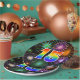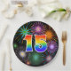 This cheerful, fun, and colourful paper plate design features a large number "15" containing a rainbow spectrum gradient inspired pattern colouring. It also features a vibrant and exciting bursting celebratory fireworks inspired pattern. It has a black coloured background. Fun paper plates like this might be used at somebody’s 15th birthday party, a 15th anniversary celebration, or some other 15th event. [~Z0000490]