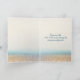 A blank invitation paper with an envelope rests on a sandy beach against the backdrop of gently swaying palm trees and a serene ocean under a vibrant sunset for 15th anniversary.