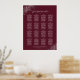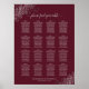 This beautiful wedding seating chart includes table assignments for 160 guests, with 10 people at each table. The design is simple yet elegant with pale gray text on a burgundy or maroon background and features lacy silver faux foil filigree in the corners with fancy script calligraphy reading "please find your table." Sophisticated and chic.