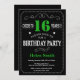16th Birthday Invitation Black and Green Typography. Chalkboard. Black and White Background. Adult Birthday. Male Men or Women Birthday. Kids Boy or Girl Lady Teen Teenage Bday Invite. 13th 15th 16th 18th 20th 21st 30th 40th 50th 60th 70th 80th 90th 100th. Any Age. For further customisation, please click the "Customise it" button and use our design tool to modify this template.