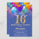 16th Birthday Blue and Gold Colourful Balloons Invitation