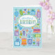 A blue birthday card for a 16th Birthday full of every kind of treat for the celebration. Cakes, presents, balloon, flowers, and party hats fill the card on a blue background and also form the bottom border on the inside of the card.