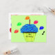 Yummy blue frosting chocolate cupcake with the look of coloured sprinkles, and red and white candle with colourful flicker flame on front of invite card with letters spelling PARTY written in colourful candy bits around cupcake. Personalise cupcake wrapper for ANY age 1st, 5th, 16th, or add a name! Chocolate cupcake on backside has blue frosting and green frosting sprinkled chocolate cupcakes and colourful party balloons including red, green, blue on a light green background. Original Artwork by TamiraZDesigns.