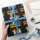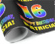 This cheerful, colourful, and fun birthday themed wrapping paper design features a large number "16" and the message "HAPPY BIRTHDAY,", both coloured with a rainbow spectrum gradient inspired pattern, along with a bold yellow personalised recipient name. The background is coloured black. Fun wrapping paper like this might be used when giving a gift or present in honour of somebody’s 16th birthday. [~Z0000475]