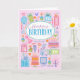 A bright pastel feminine birthday card for a 16th Birthday full of every for a celebration. Cakes, presents, balloon, flowers, and party hats fill the card on a pink background and also form the bottom border on the inside of the card.