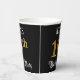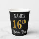 This ornate and opulent birthday paper cup design features a customisable name and the message “16th Birthday Party”. The large number “16th” has an imitation/faux gold-inspired colouring pattern, and the words “Birthday Party” are in elegant script-style text. The background is coloured black by default (although it can be customised). Luxurious, fancy paper cups like this might be used at a birthday party/celebration being held in celebration of somebody’s sixteenth birthday. [~Z0000567]