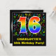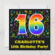 The front of this fun, exciting, and vibrant birthday party invitation design features a large number "16" with a rainbow spectrum gradient inspired pattern, along with an editable name and the message "16th Birthday Party!" Part of the background features a fun pattern of various music notes and symbols having a variety of colours and sizes. The back features personalised information regarding the event that the potential guests are being invited to. Happy, personalised birthday celebration invitation cards like this might be sent to potential guests of a gathering being held to honour a song composer’s, a singer’s, a musician’s, or somebody else’s 16th birthday. [~Z0000427]