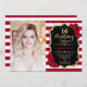 16th birthday party invitation with your photo. Features dark red white stripes, script font, roses and confetti. Classy black white red design with faux glitter gold. Perfect for an elegant sweet sixteen bday celebration.